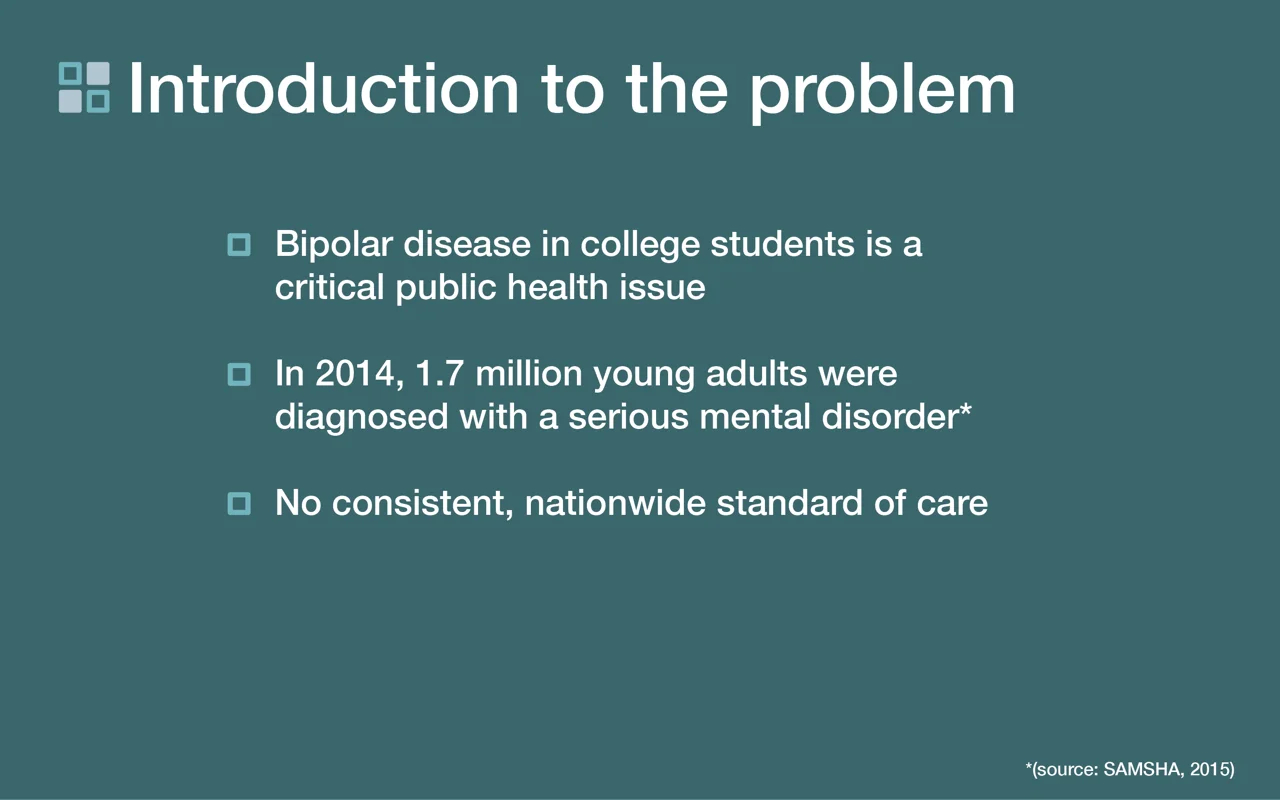 Bipolar disease in college students is a critical public health issue and presents a significant challenge to college health services, faculty and the families of these young adults. In 2014, an estimated 1.7 million people age 18 to 25 were diagnosed with a serious mental disorder (SAMSHA, 2015). Students with bipolar disorder often bear the burden of stigma and social isolation which further facilitates a lack of sense of belonging with their college community and can impede help seeking behavior and engagement with mental health services. The National Alliance on Mental Illnesses (NAMI) 2012 survey report on mental health found that stigma remains the number one barrier to students accessing services and supports on campus among other barriers such as their busy schedule, limited hours of service, lack of information, and long appointment waitlists (NAMI, 2012). Colleges are overwhelmed by the increase of mental health related demands and there is no consistent, nationwide standard of mental health care on campuses (Wilson, 2015). The need for systematic improvements is timely as students with significant mental health problems have double the risk of departure from college (The Healthy Minds Network, 2013).